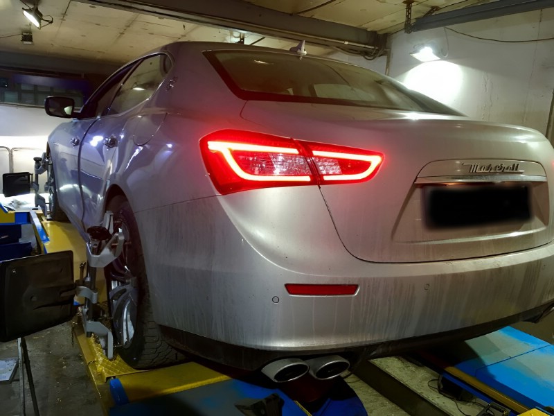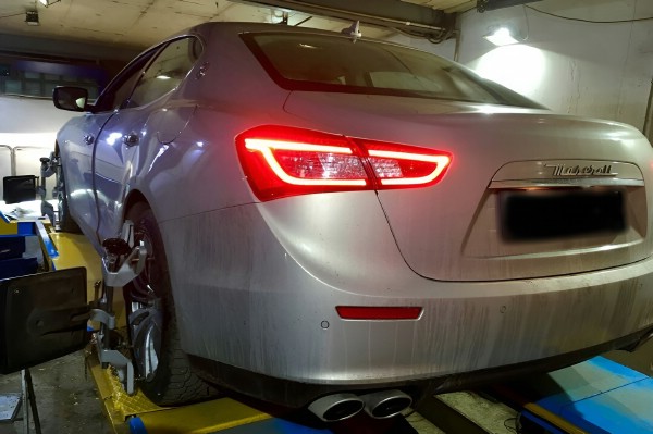 Maserati Ghibli сочетает мощный двигатель и задний привод. Подвеска настроена под динамику и контроль на скорости. При таком характере любая ошибка в углах установки колес быстро проявляется. Машина начинает менять траекторию даже на ровной дороге.